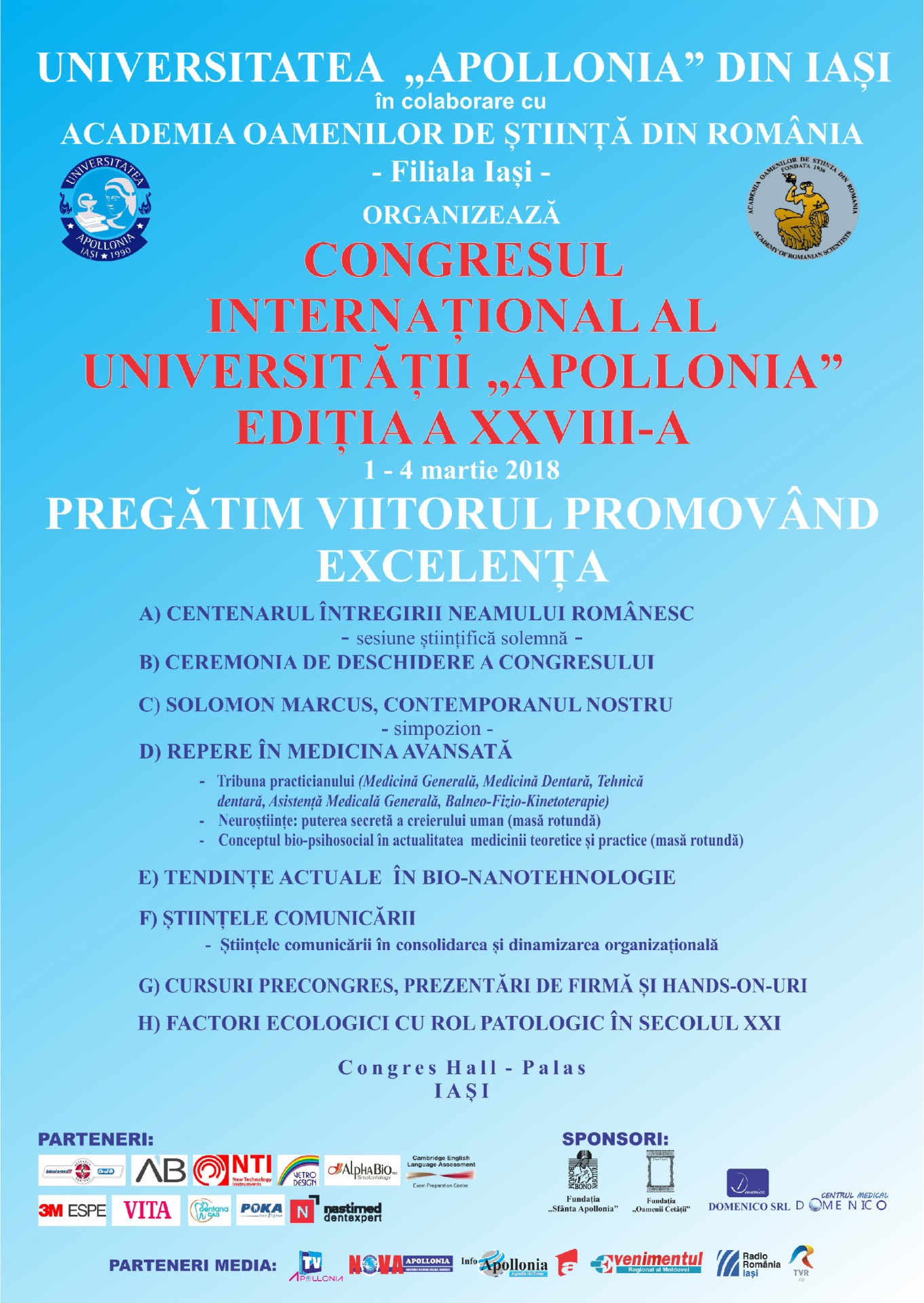 Universitatea „Apollonia” din Iasi organizeaza in perioada 1 – 4 martie 2018, cea de-a XXVIII-a editie a Congresului International sub sloganul „Pregatim viitorul promovand excelenta”.